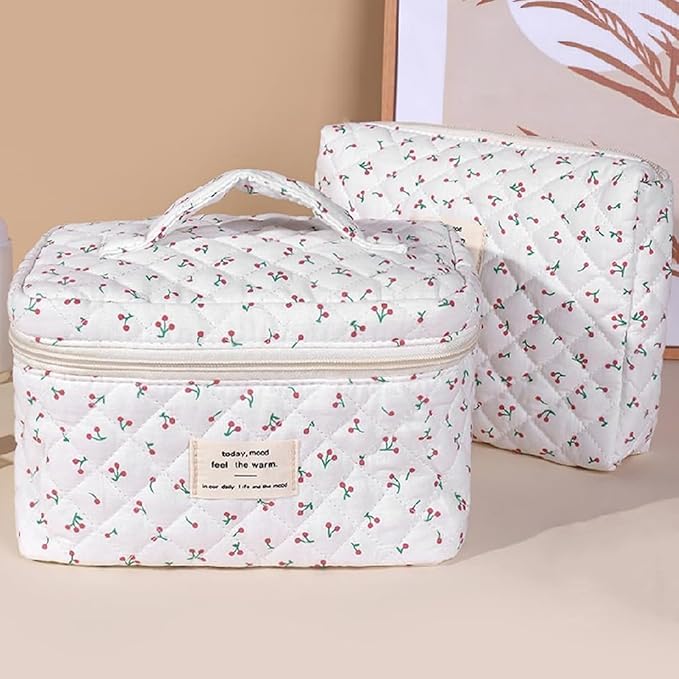 3 Pcs Quilted Makeup Bag Set,Cotton Coquette Make Up Bag,Cute Floral Makeup Bags Large Toiletry Cosmetic Bag Organizer for Women Girls (P1-3PCS)