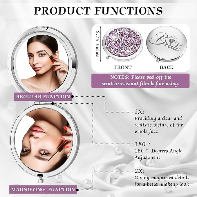 • Exquisite Styles: showcasing an exquisite style, the front of each compact mirror is inlaid with small, shining rhinestones, creating an elegant shine; Moreover, the back is engraved with [Bride] and [I Do Crew] words, adding attractiveness and charm to these beautiful accessories