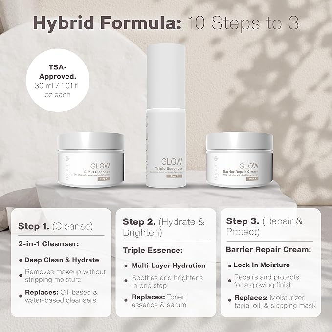 • SIMPLIFIED 3-STEP MINI SKIN CARE (PATENT PENDING): This travel size skincare set combines a complete 10 Steps Korean Skincare routine to three powerful hybrid formulas: cleanser, essence, and cream, simplifying routines with innovation and convenience. Perfect for busy lifestyles.