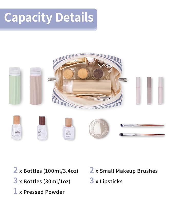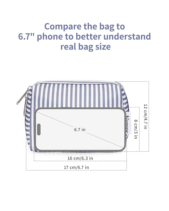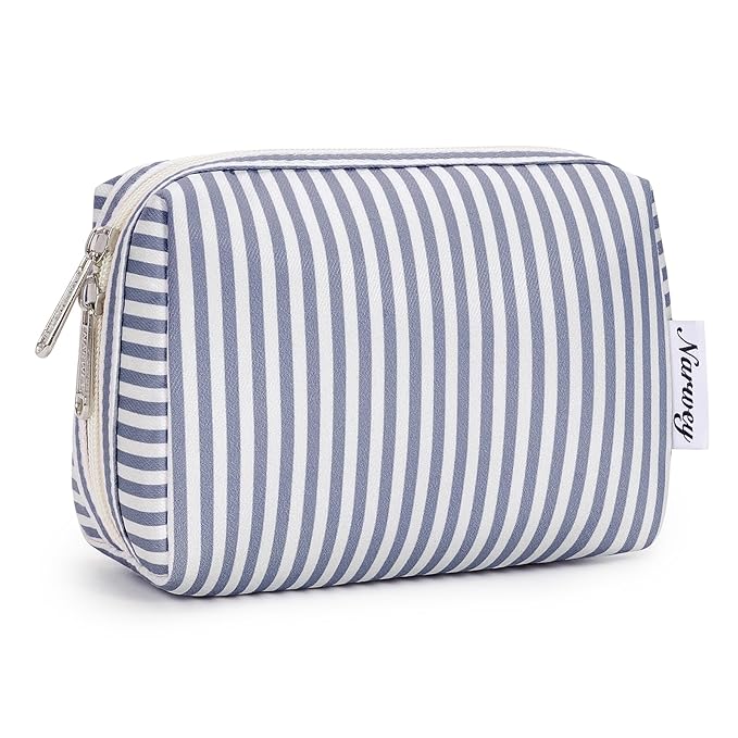 Narwey Small Striped Makeup Bag for Purse Mini Cosmetic Bag Travel Makeup Pouch Zipper Pouch Cute Make up Bags with Compartments for Women Girls (Greyish Blue Stripe, Small)