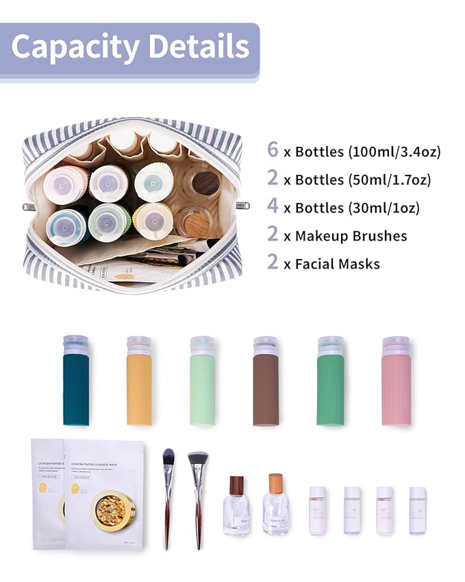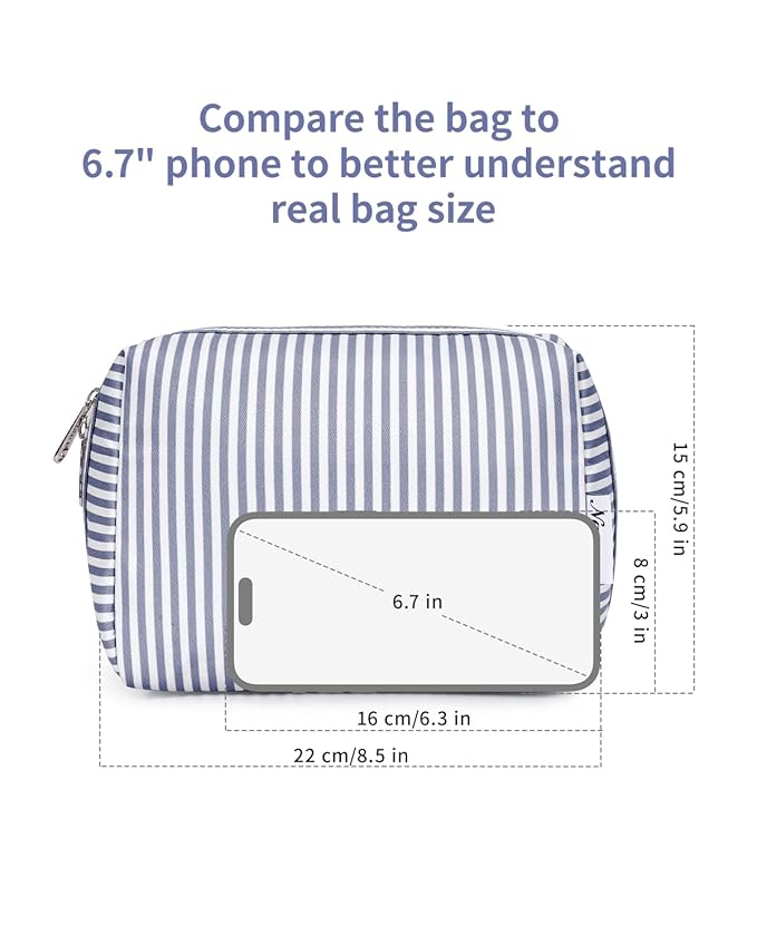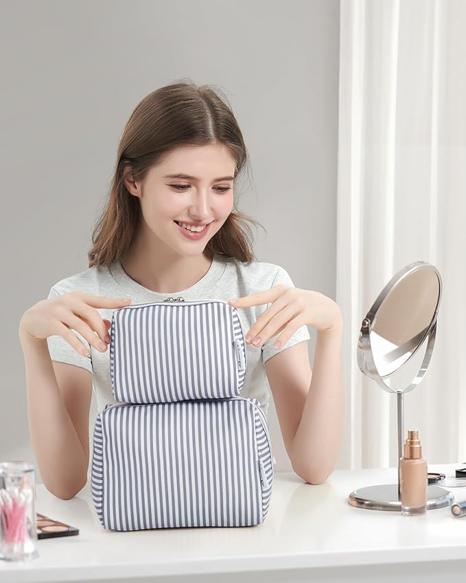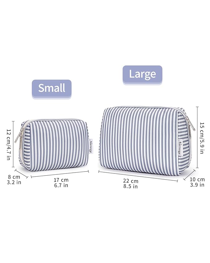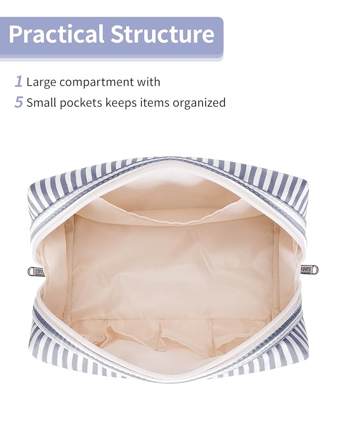 Narwey Striped Makeup Bag Travel Cosmetic Bag Organizer Toiletry Bag Make Up Bags with Compartments for Women Girls (Large, Greyish Blue Stripe)