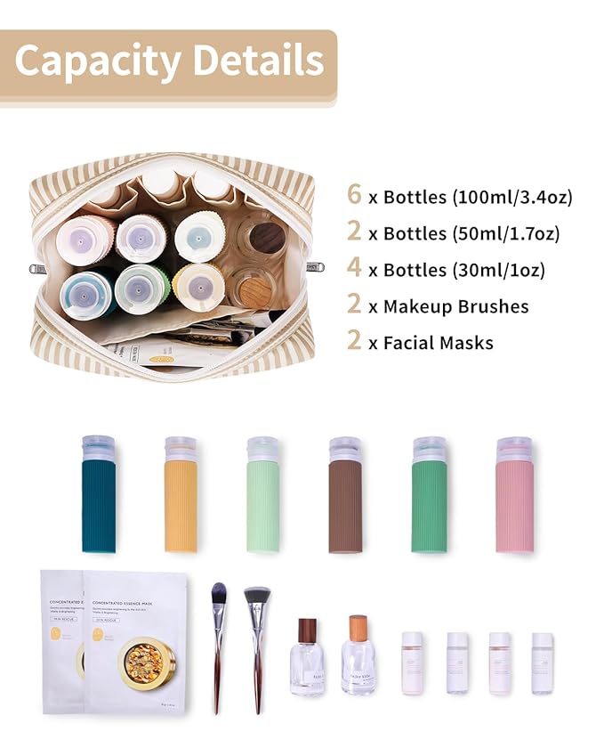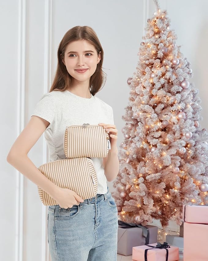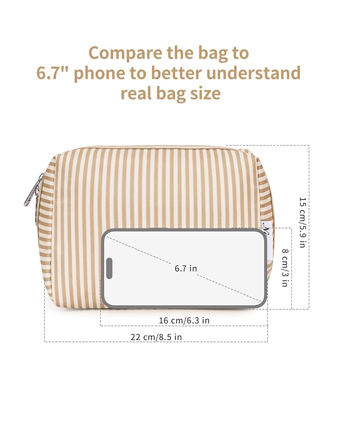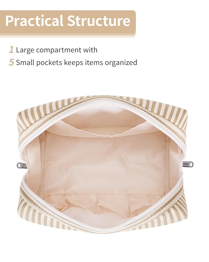 Narwey Striped Makeup Bag Travel Cosmetic Bag Organizer Toiletry Bag Make Up Bags with Compartments for Women Girls (Large,Brown Stripe)