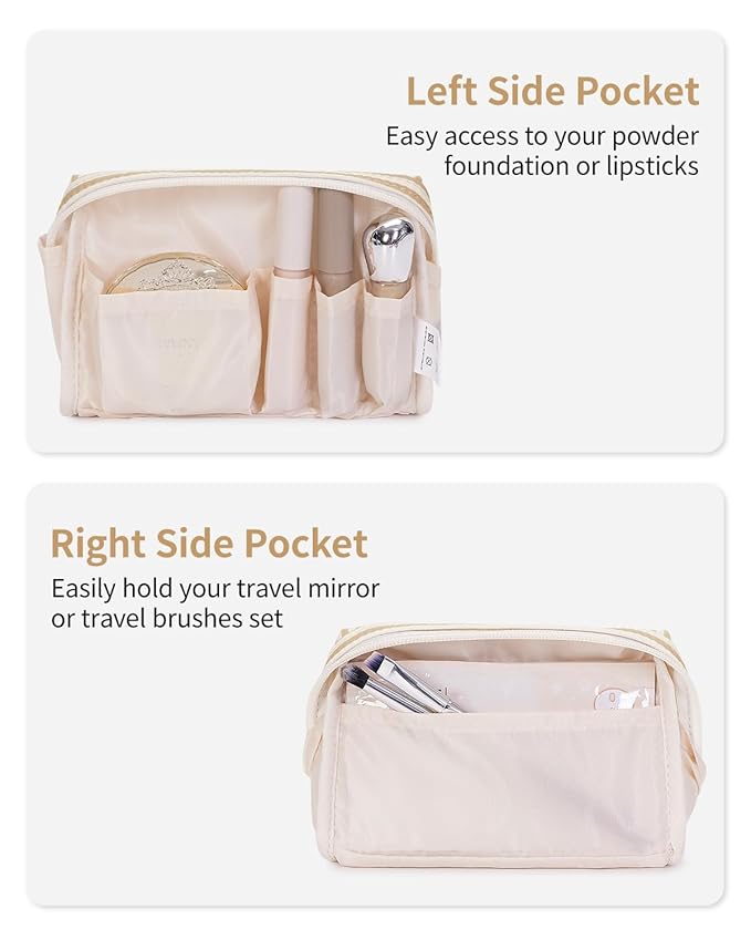 - Multiple Storage Compartments - Practical main compartment with 5 inner small pockets could neatly organize your makeup. Main compartment could hold many small items. Left side pockets could hold your concealer or lipsticks, while right side pocket are great for your travel mirror or travel brushes set. It could fit lipstick, blushes, powder, eyeliner, foundation, concealer, eyeshadow pallet, mascara, lash curler, sponage, small brushes