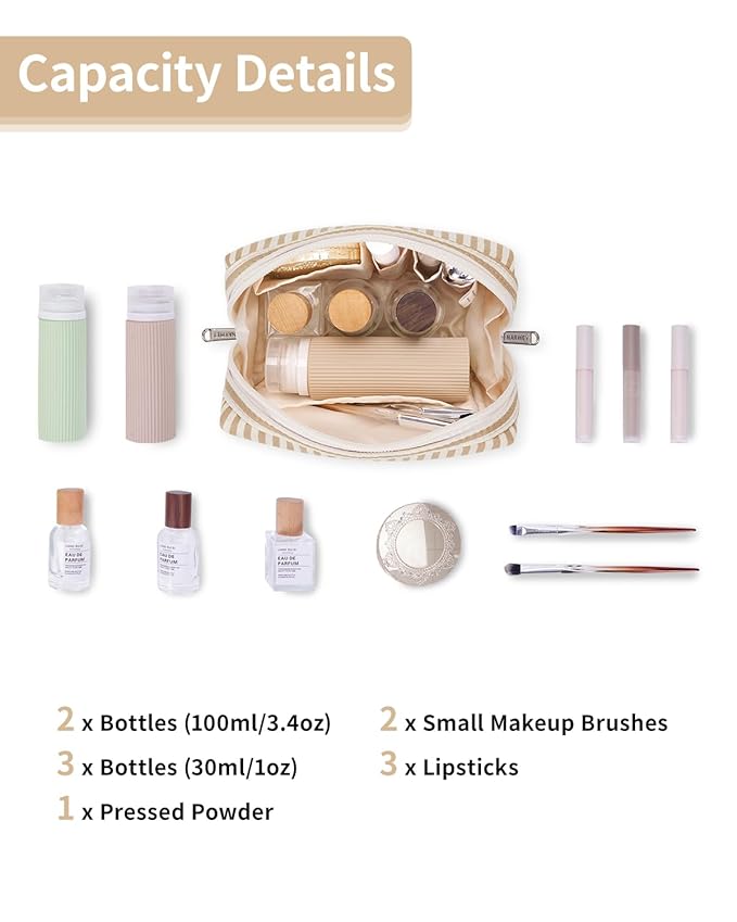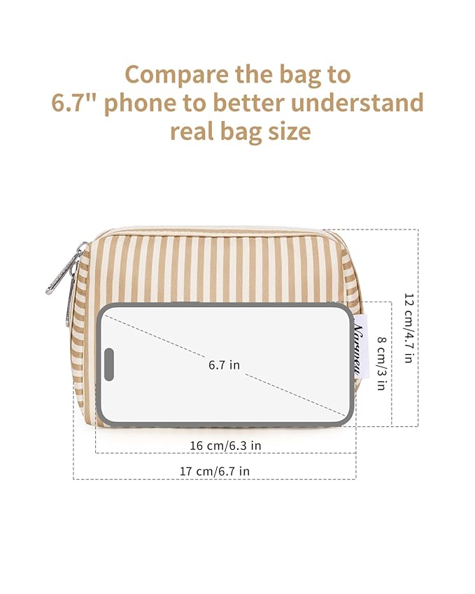 Narwey Small Striped Makeup Bag for Purse Mini Cosmetic Bag Travel Makeup Pouch Zipper Pouch Cute Make up Bags with Compartments for Women Girls (Brown Stripe, Small)