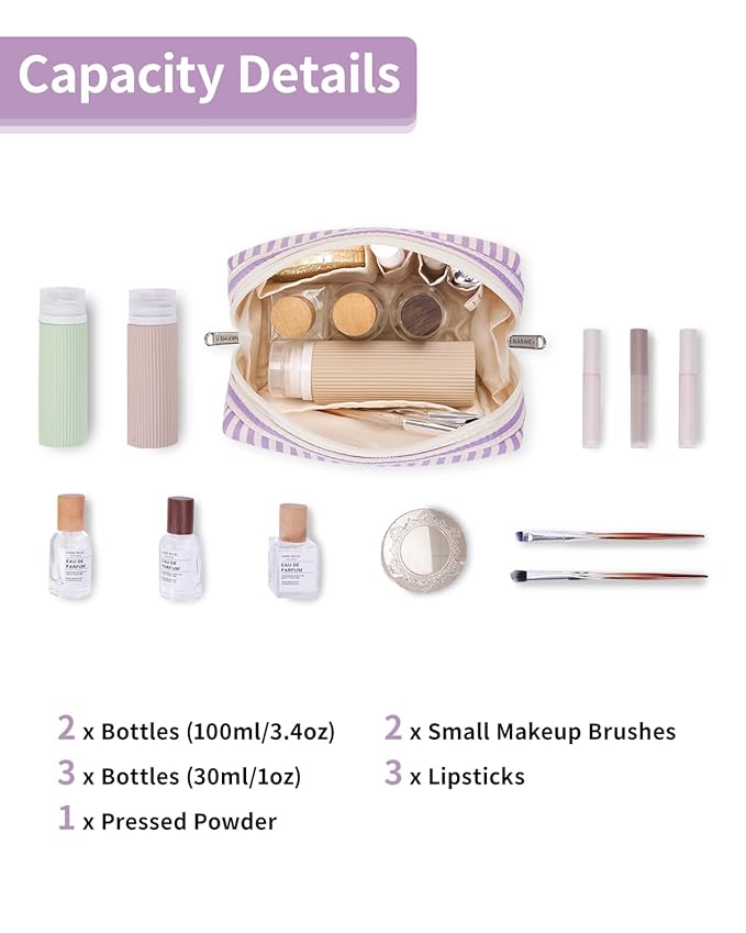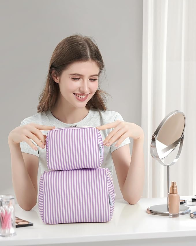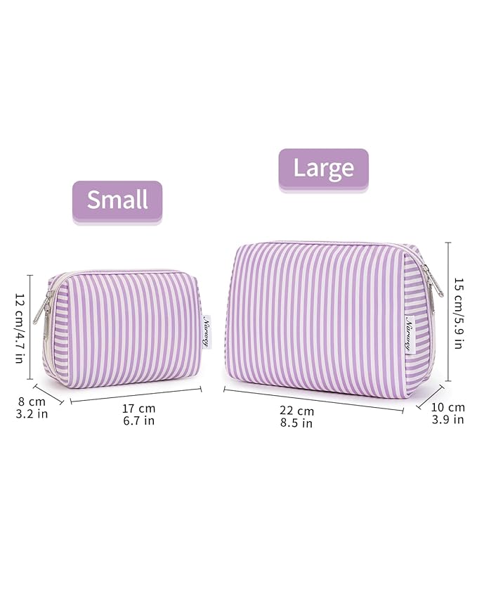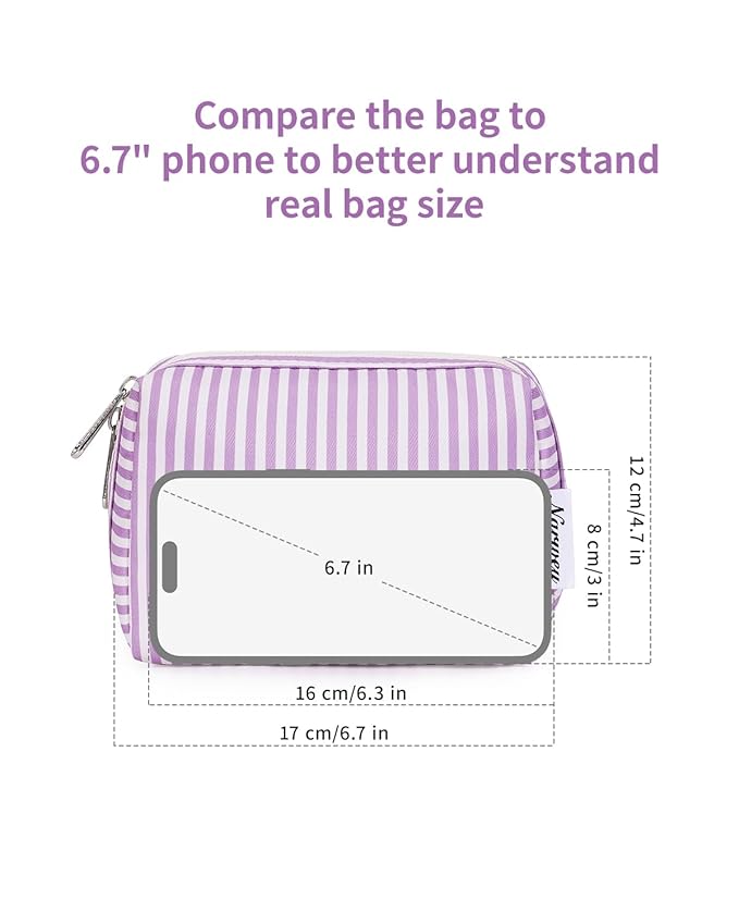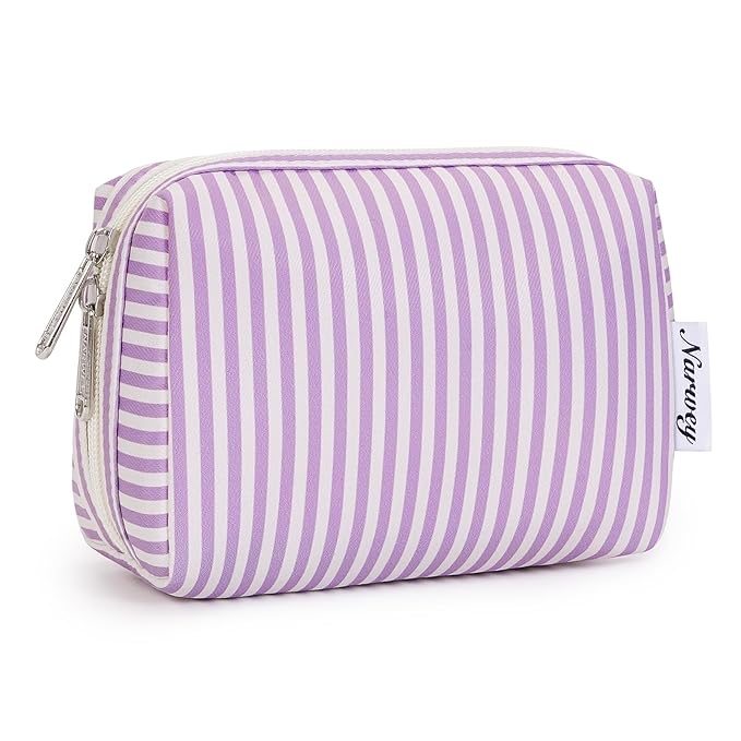 Narwey Small Striped Makeup Bag for Purse Mini Cosmetic Bag Travel Makeup Pouch Zipper Pouch Cute Make up Bags with Compartments for Women Girls (Purple Stripe, Small)