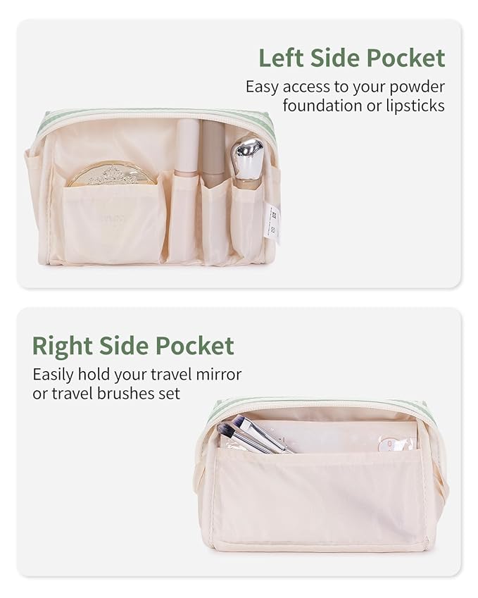 - Multiple Storage Compartments - Practical main compartment with 5 inner small pockets could neatly organize your makeup. Main compartment could hold many small items. Left side pockets could hold your concealer or lipsticks, while right side pocket are great for your travel mirror or travel brushes set. It could fit lipstick, blushes, powder, eyeliner, foundation, concealer, eyeshadow pallet, mascara, lash curler, sponage, small brushes