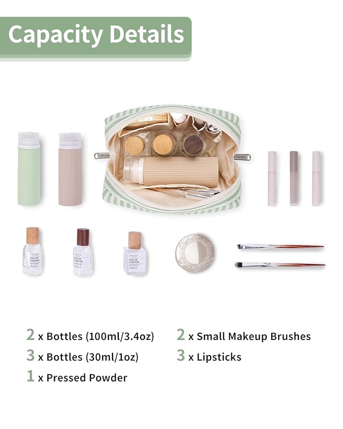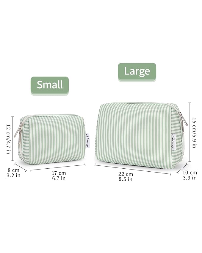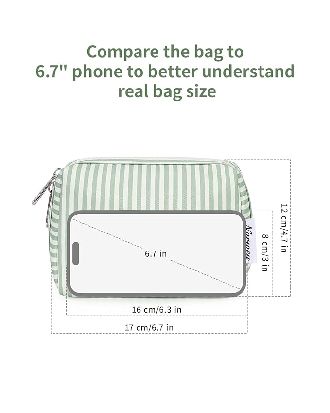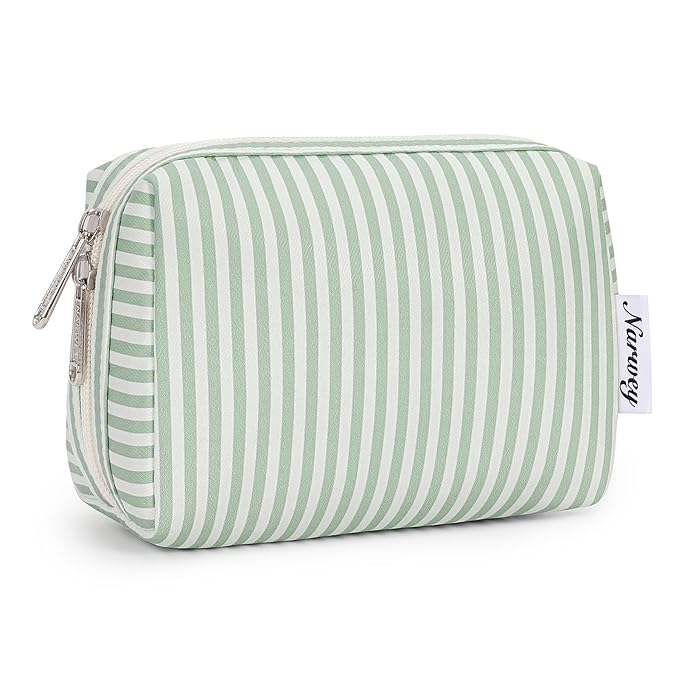 Narwey Small Striped Makeup Bag for Purse Mini Cosmetic Bag Travel Makeup Pouch Zipper Pouch Cute Make up Bags with Compartments for Women Girls (Mint Green Stripe, Small)