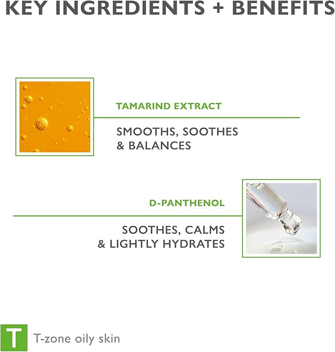 - Soothing: Tamarind extract and D-panthenol reduce visible pores, calm irritation, and condition the skin.