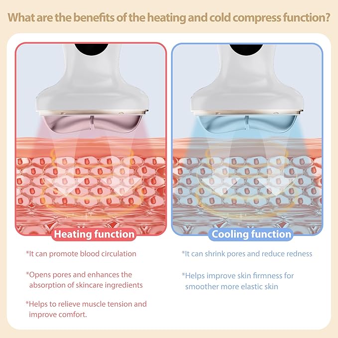 - Innovative Design - Unlike ordinary face and neck massage tools on the market, we have added a cold compress to the original heating function. The heating function can promote blood circulation, open pores, enhance the absorption of skin care ingredients, help relieve muscle tension and improve comfort. The cooling function can shrink pores, reduce redness and swelling, help improve skin firmness, and make the skin smoother and more elastic.