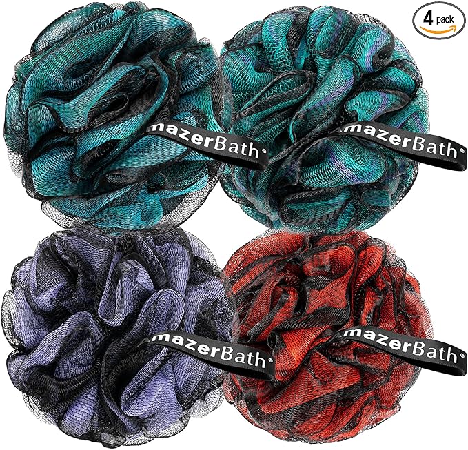 AmazerBath Charcoal Loofah Sponge, Large Shower Loofah 75g/PCS - Body Scrubber Loofa Set of 4 - Charcoal Blue, Green, Purple & Red, Bath Sponge for Men and Women
