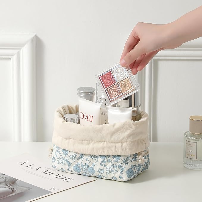 3pcs Large Cotton Quilted Makeup Bag Set,Coquette Aesthetic Cute Travel Toiletry Bag,Drawstring Gift Bag for Women and Girls(3Pcs Light Blue)
