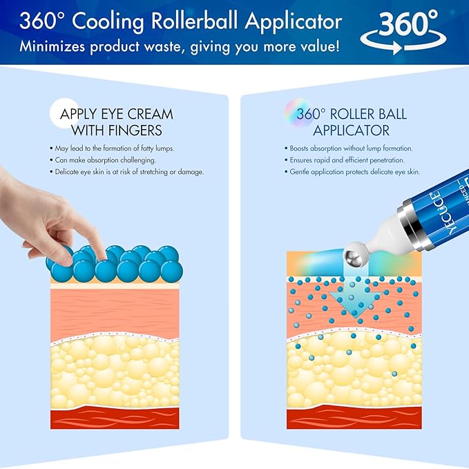 • 【360 Massage Roller Ball】: Our eye cream uses a stainless steel roller ball applicator to bring a cool and refreshing sensation, which helps to stimulate blood circulation around the eyes and enhance the absorption of active ingredients.