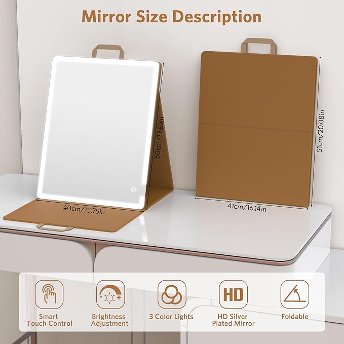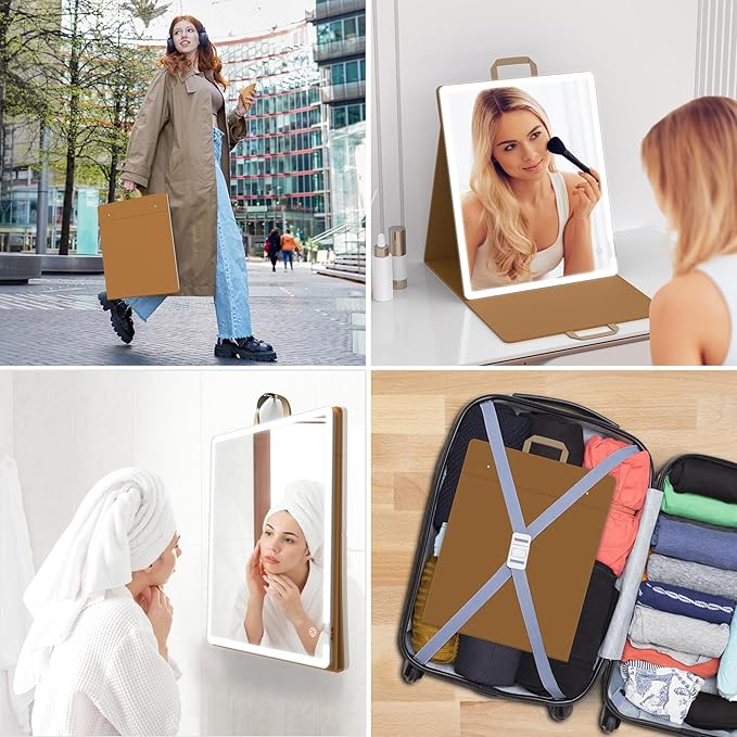 - [Portable Hanging Design] The ultra-thin, light, and hanging design of this makeup mirror will make you love it when makeup. The overall size is 50 x 40 cm (19.69 x 15.75"), and the folded thickness is 1.5 cm (0.59") the larger vision allows you to easily get the perfect makeup to show the best you to the world.