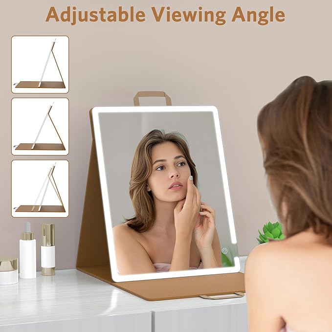 - [Adjustable three-color Light Makeup Mirror] This makeup mirror has 120 LED lights, and you can freely switch between three modes: soft warm color, neutral white, and natural daylight. The touch screen on the makeup mirror can brighten or darken the portable mirror, simulating different scenes such as day and night. This portable makeup mirror allows you to dress yourself carefully under comfortable lighting, while also protecting your eyes