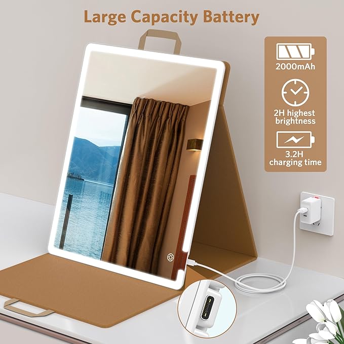 - [Rechargeable Makeup Mirror with Light]The makeup mirror has a built-in 2000mAh rechargeable battery, which can work continuously for several hours after being fully charged. Sufficient power allows you to avoid frequent charging. The charging port of the rechargeable vanity mirror is a Type-C port, which is suitable for computers, mobile power supplies, ordinary sockets, etc. Foldable vanity mirror for stable placement on tabletops