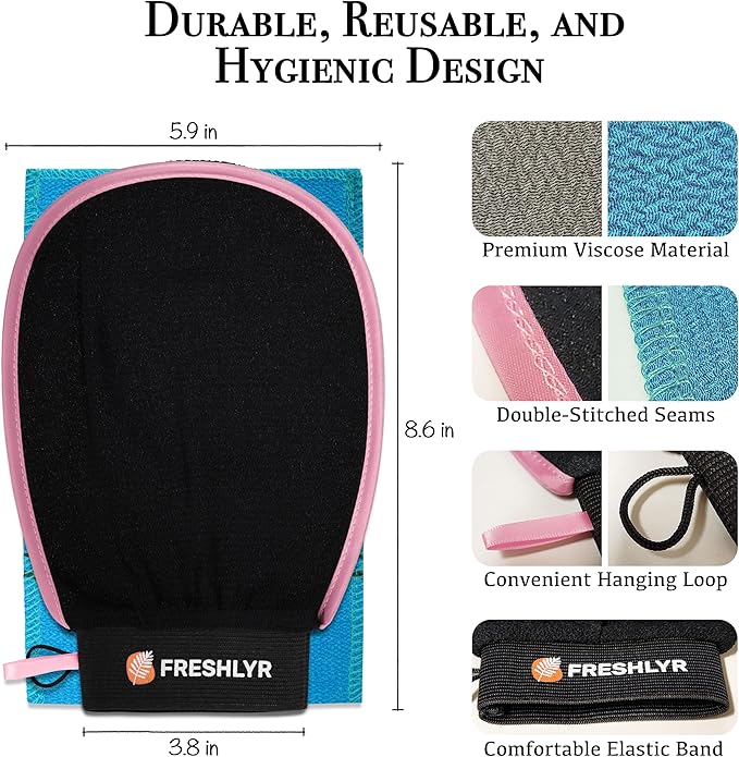 - Achieve Smoother, Healthier Skin with FRESHLYR - Our Premium Exfoliating Glove offers a Korean spa-inspired exfoliation experience that reveals soft, glowing skin. For those looking to improve skin texture and remove dead skin, using our Deep Exfoliating Gloves 2–4 times a month during your shower will help you maintain smoother, more radiant skin while effectively removing built-up impurities.