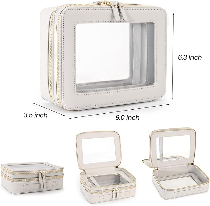 • ❤【STYLISH & PREMIUM QUALIYY】Unlike other flimsy and collapsible pvc bags, our 2-layer cosmetic pouch which made of premium saffiano PU leather and thick vinyl can keep a good structure. Together with the beautiful stitches and whisper-quiet metal zippers, this make up bag is durable for long-lasting use. It's the clear pouch you'd be happy with sitting out on display beside you.