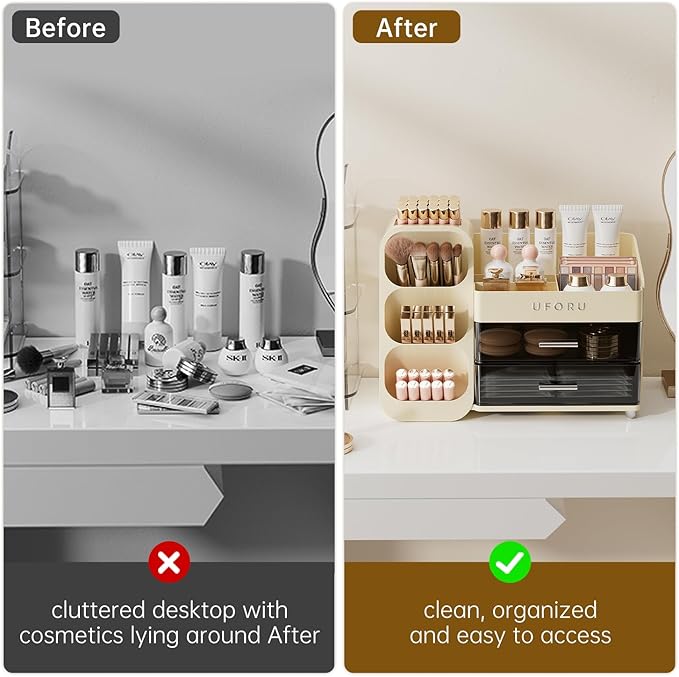 • Spacious Design: This makeup organizer for vanity features a thoughtfully designed compartmentalized structure, allowing you to neatly store and display all your beauty essentials