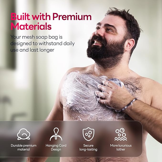 - [RICH LATHER] Our soap pouch for shower stands out with its robust structure, creating a rich lather quickly and enhancing your bathing exfoliation. The soap bag also maximizes soap efficiency, saving up to 10-20% of the soap bar