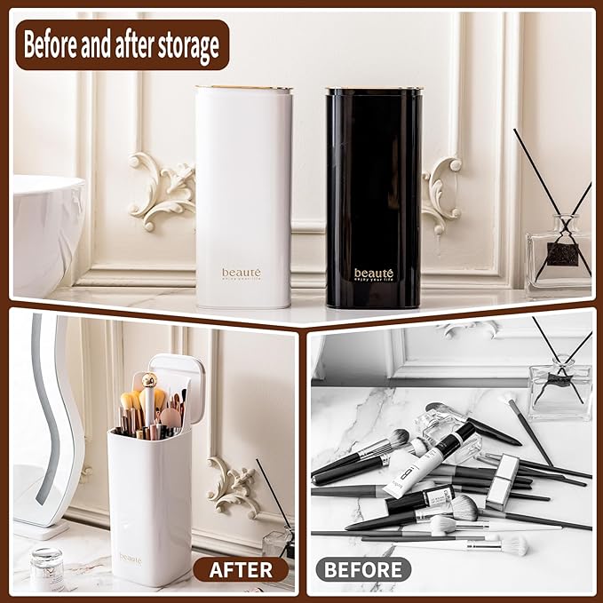 • Suitable for Multiple Scenarios, this makeup brush organizer can save most of the space on both the vanity and bathroom countertop, freeing up messy space. Its waterproof and dustproof design makes your makeup brush more perfectly organizer