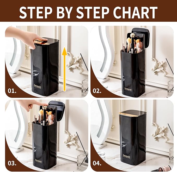 • Exquisite Design, this is a press type makeup brush holder. Simply press the lid lightly to open this makeup brush organizer. You can see that the makeup brush automatically rises and presents itself in front of you. After use, press the middle ball to complete the storage