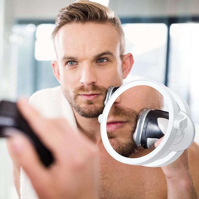 - Shaving mirror or desk mirror: You could get mirror suction to sitck to large bathroom mirror, good for daily shaving and getting closest shave possible. The 10X magnification with lights allows you to ensure all beard hairs a trimmed and clean look. You can use it as a stand up mirror on your vanity too. Since the mirror gets a short stand, you may need to bend over when using it.