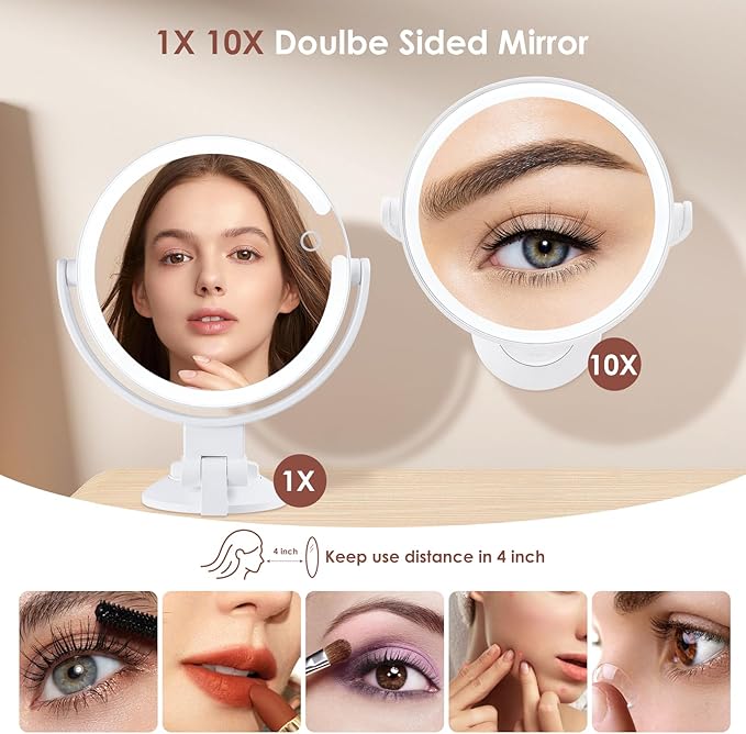 - Great magnification for vision needs: A double sided 1X 10X magnification mirror is great for from putting on your makeup to grooming eyebrows and shaving. It magnifies 10x without distortion. Your face needs to be closer up (in 4") to it to get a crystal reflection in mirror.