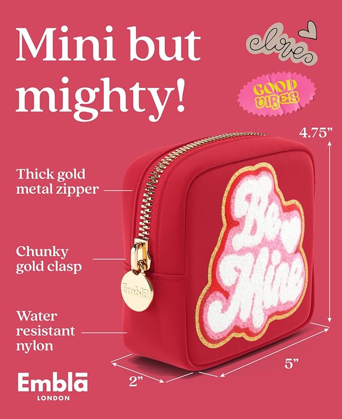 - GIVE THE GIFT OF LOVE AND FASHION with Emblaβs new mini cosmetic pouches with chenille patches that express your affection including checkered hearts, XOXO, LOVE, and BE MINE. Ideal present for wife, girlfriend, mom, grandmother, daughter, bridesmaids, teachers, cheer teams, Valentine's Day, Mother's Day, Anniversaries, or Birthdays. Available in Flamingo Pink, White and Ruby Red.
