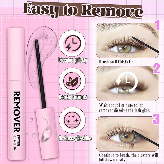 - Gentle Lash Remover for Easy Clean-Up: The lash remover is specially formulated to dissolve the eyelash adhesive effortlessly without damaging your natural lashes, ensuring a safe and gentle removal process.