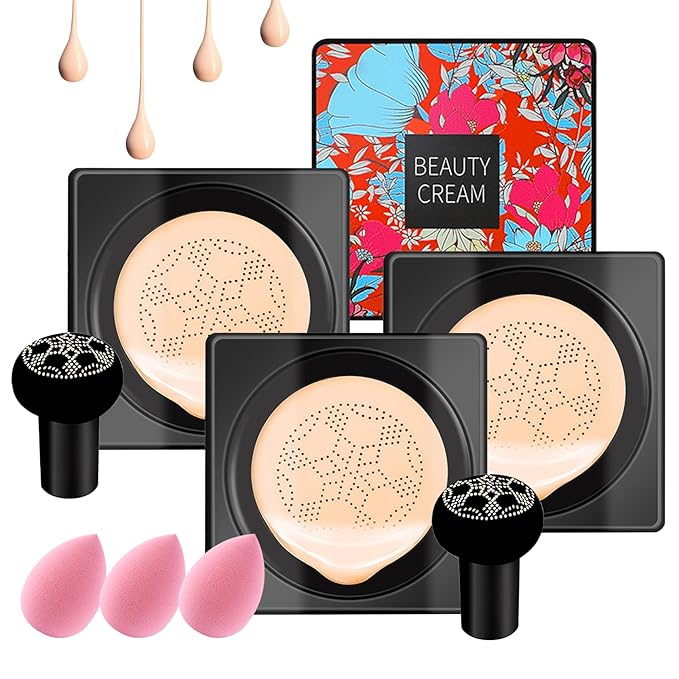 Mushroom Head Air Cushion CC Cream Set,3PCS BB Cream Full Coverage Foundation,Moisturizing Oil Control CC Cream Cushion Foundation,Matte Nude Makeup Foundation & Makeup Sponge (Natural)