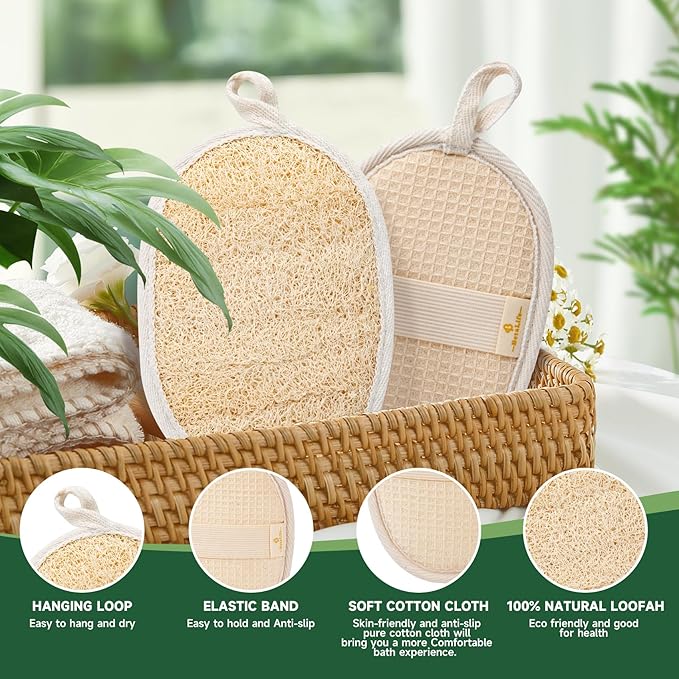 - [NATURAL MATERIAL PROTECT YOUR SKIN ] Our Loofah Sponges Is Made By 100% Natural Loofa And Pure Cotton,Our Natural Loofah Sponges Is Gentle Exfoliating Proudcts , It Will Deeply Clean The Skin Without Hurting Your Skin And Improve Body Blood Circulation ,It Will Offer You a Mild And Gentle Bathing Experience .