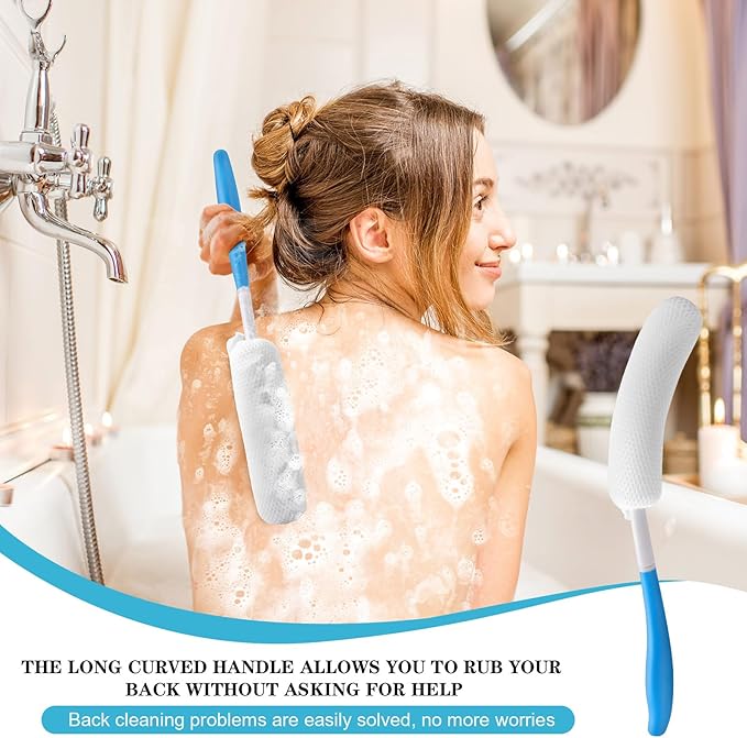 Sunnyray 2 Pack 15.35 Inch Long Anti-Slip Curve Handled Bath Body Brush, Body Back Bath Brush with Sponge Soft Blue Rubbing Back Shower Brush for Elderly Aid Bathing and Shower