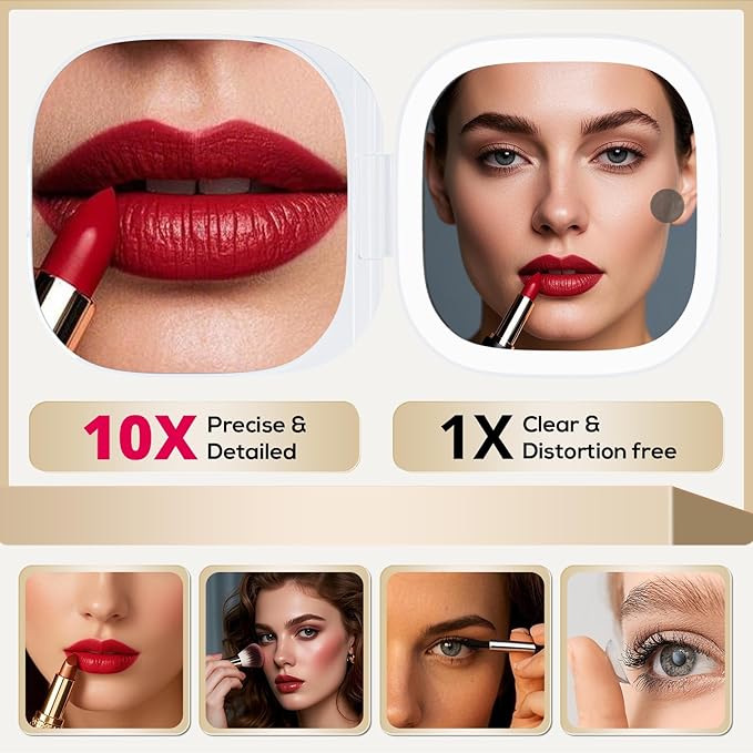 • 【High Definition 1X/10X Mirrors】This mirror has a high definition 1X side and a true 10X magnification side, 1X-copy. your charm - you can apply lipstick and sunscreen anytime. 10X - Magnify Your Beauty - You can draw delicate eyebrows, apply delicate makeup, accurately remove excess hair that is not usually visible, and wear contact lenses and artificial eyelashes accurately. A portable and practical mini makeup mirror