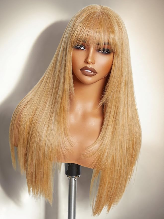 GORGIUS Straight Glueless Wig with Bangs Golden Blonde Layered Hair Ready-to-Go Synthetic Bang Wigs with Realistic Scalp 24 Inch