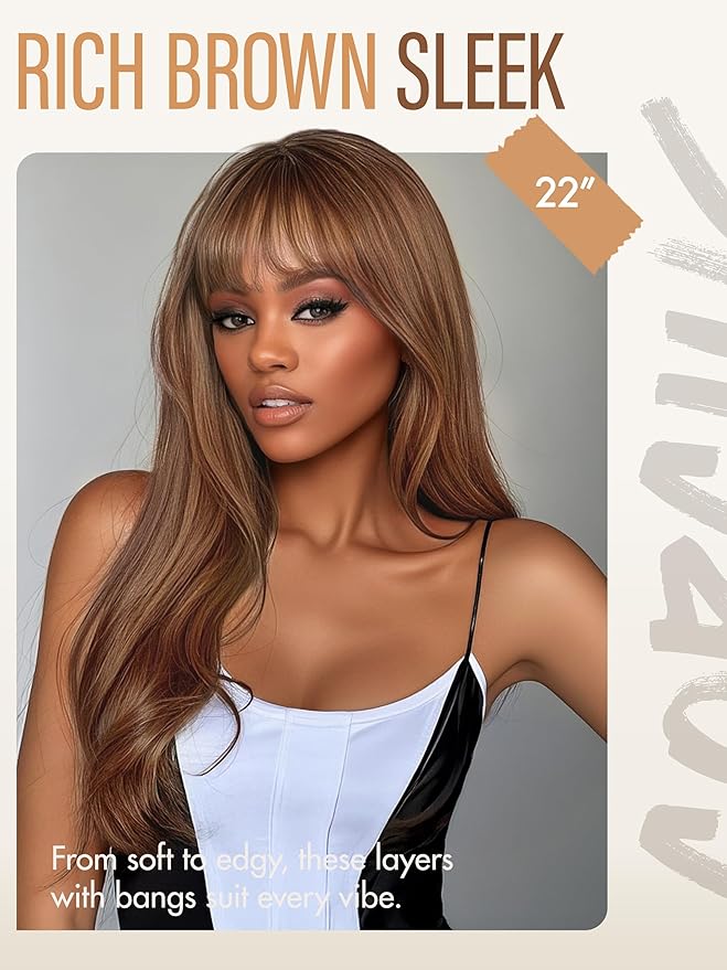 GORGIUS Straight Glueless Wig with Bangs Medium Brown Layered Hair Ready-to-Go Synthetic Bang Wigs with Realistic Scalp 24 Inch
