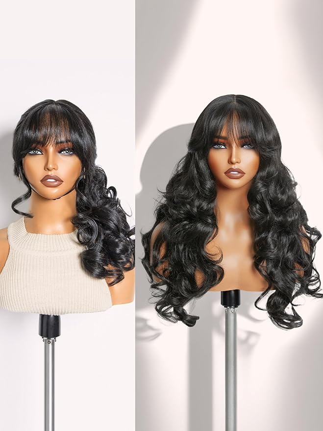 - Glueless & Beginner-Friendly – No glue, no lace, no hassle! This wavy wig with curtain bangs is easy to install and perfect for beginners. Just put it on and go!