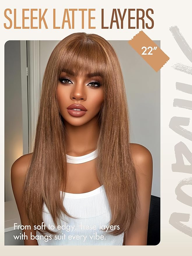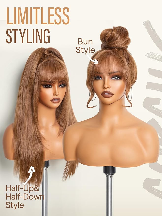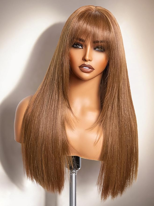 GORGIUS Straight Glueless Wig with Bangs Honey Brown Layered Hair Ready-to-Go Synthetic Bang Wigs with Realistic Scalp 24 Inch