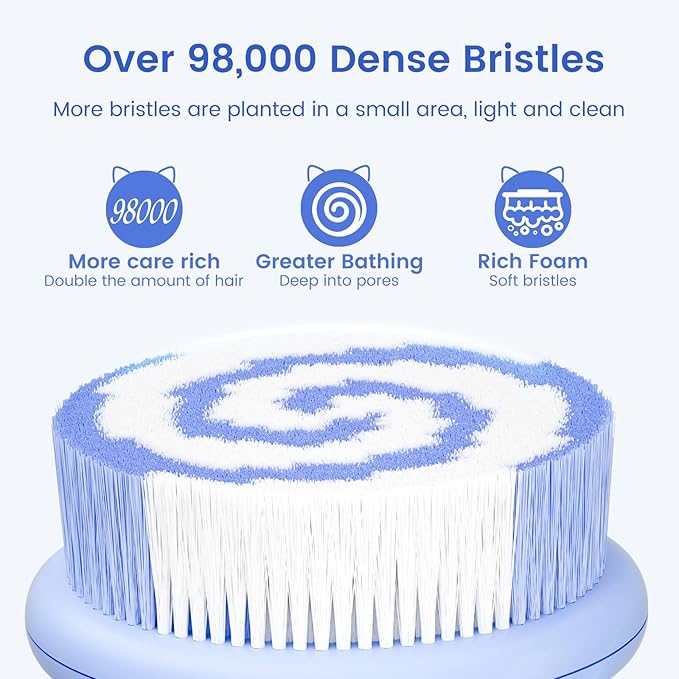 - 2 Brush Heads for Deep Clean & Skincare: Includes a fluffy 98000-bristle foaming brush for a rich lather and a massage head to evenly apply oils or lotions, cleanses deeply while pampering your skin