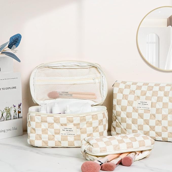3Pcs Cotton Quilted Makeup Bag Set,Large Floral Cosmetic Bag,Aesthetic Toiletry Travel Makeup Bag Set and Cute Flower Bag for Women Girls (White Brown Plaid)