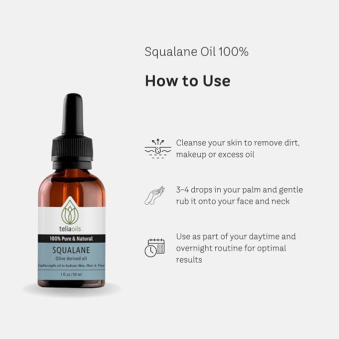 - DEEP HYDRATION: Discover the power of squalane oil with TeliaOils' 100% squalane oil, crafted from the finest olives to ensure premium skincare results. This natural face oil deeply nourishes and moisturize your skin, boosting skin elasticity, leaving your skin soft.