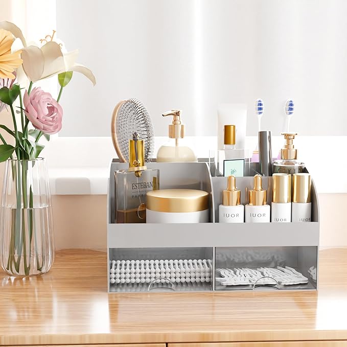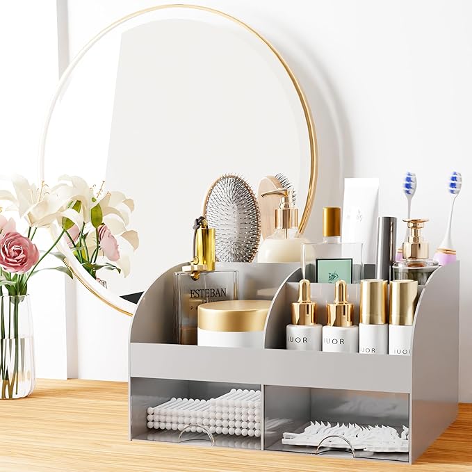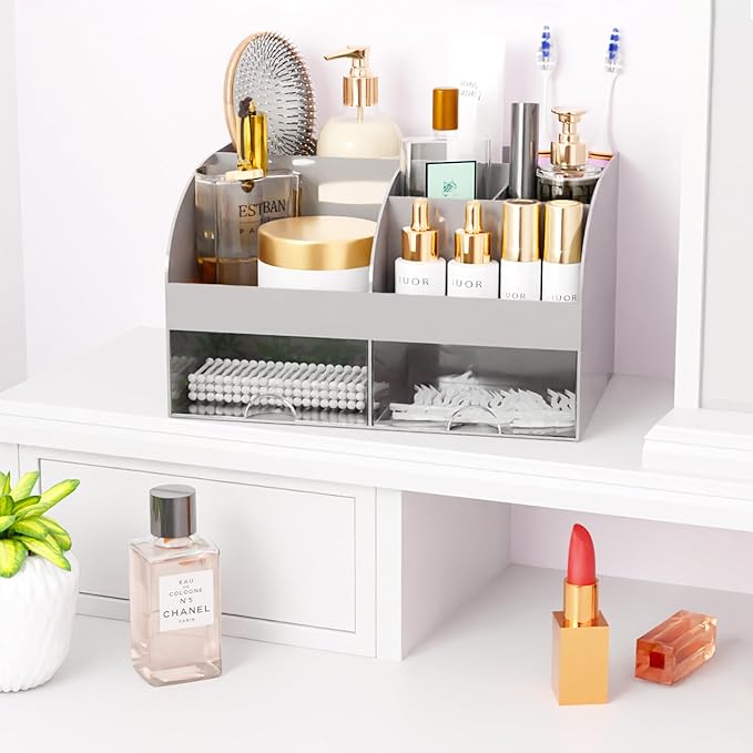 Makeup Organizer with Drawers, Cosmetic Storage for Dresser Vanity and Bathroom Countertop, Beauty Holder for Lipstick Brush, Skincare Organizer for Vanity, Cosmetic Display Case (Grey)