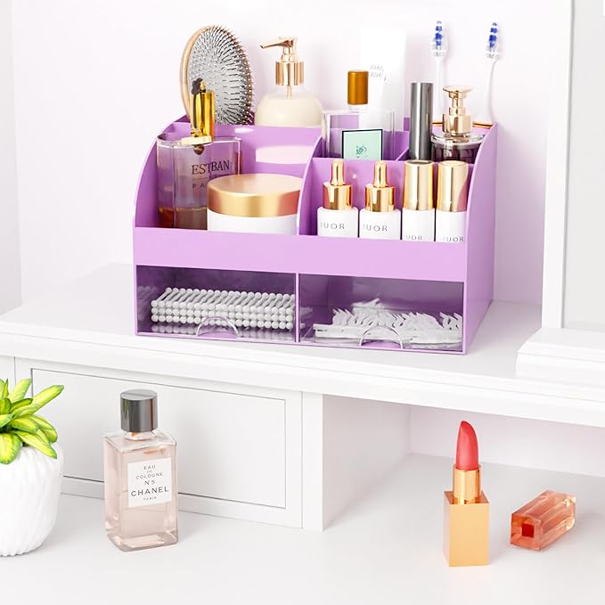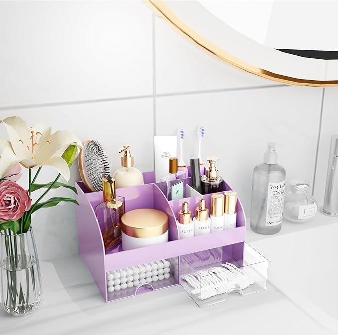 Makeup Organizer with Drawers, Cosmetic Storage for Dresser Vanity and Bathroom Countertop, Beauty Holder for Lipstick Brush, Skincare Organizer for Vanity, Cosmetic Display Case (Purple)