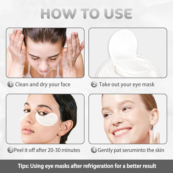 • [Effortless Skincare, Convenient Results] Designed for easy use, these under-eye patches absorb quickly, making skincare simple and effective. Clean your face, place the patches under your eyes, and leave them on for 20 minutes. Use daily or as needed for refreshed and youthful-looking eyes with minimal effort