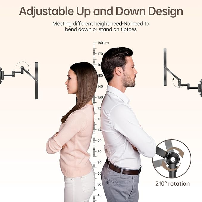 • 360°Rotation & Extendable Arm Makeup Mirror: The multiple joints of the wall-mounted makeup mirror with retractable arm allows you to fix the mirror in the best position and adjust the arm to any angle you need to achieve perfect viewing.The flexible mirror arm can be freely extended so that the magnifying mirror can be adjusted to the right viewing angle and distance, allowing you to freely apply makeup,shaving or wearing contact lenses, etc. You can fold the mirror on the wall to save space when you are not using it.