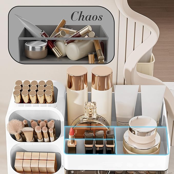 - Spacious Drawers with Handles: 2 large transparent drawers provide ample storage for makeup palettes and beauty essentials. The clear design lets you quickly find what you need, keeping your makeup vanity or bathroom counter clutter-free and organized