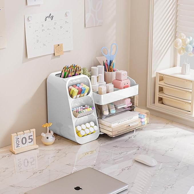 - Multi-Layer Makeup Storage: Features 2 spacious drawers, 1 divided top compartment, and 4 built-in brush holders, offering versatile storage options for cosmetics, skincares, beauty tools, and more. Allowing you to store all your make up essentials in an efficient way