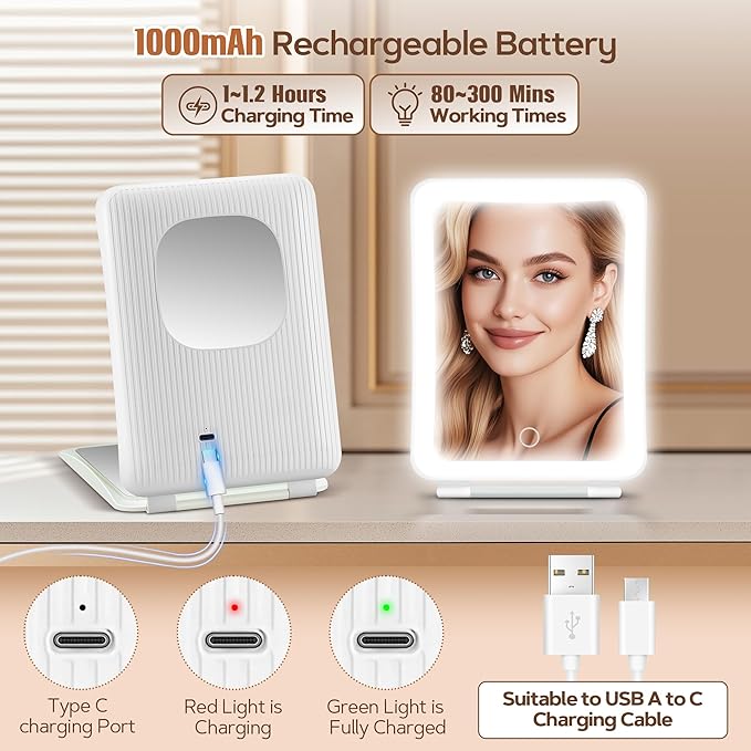 • 1000mAh Rechargeable Battery: Only compatible with USB A to C charging cable, this lighted compact mirror with magnification needs to 1~1.2H charging time and lasts for 80 minutes in the brightest mode.