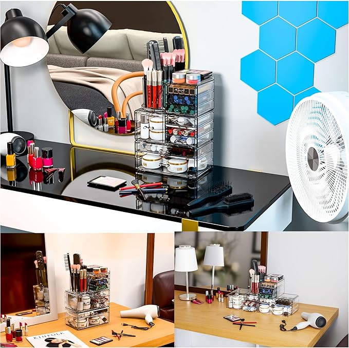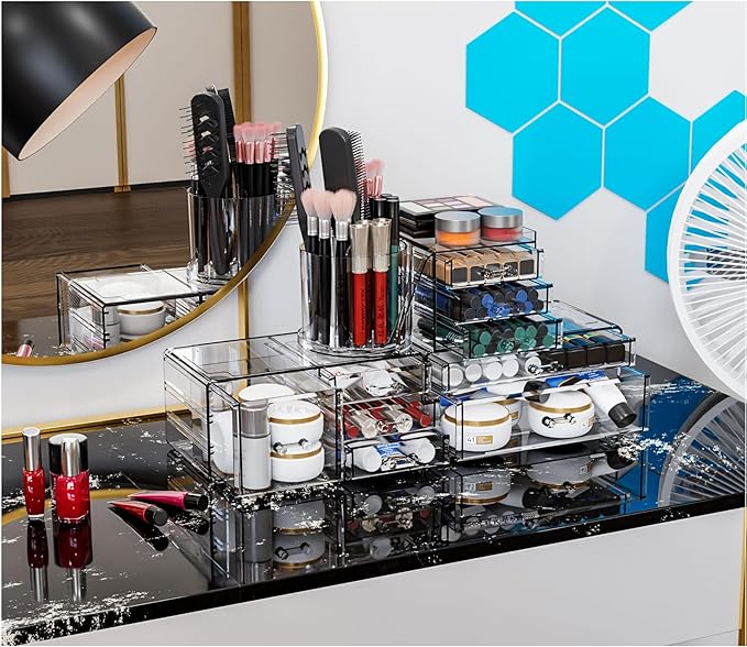 - 【Perfect Makeup Storage Box】organizer drawer Size: The makeup brush holder and skincare organizer have drawers of different heights, shapes, and sizes to fit all your cosmetics.This skincare holder has not only decluttered your beauty space but also enhanced the overall aesthetics
