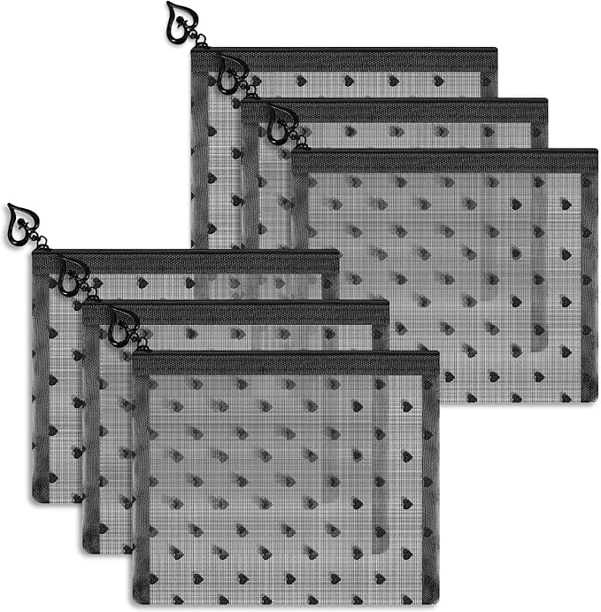 6 Pack Mini Zipper Mesh Makeup Bags, Heart Print Nylon Cosmetic Bags Toiletry Bags for Office Travel Organization (Black, S)