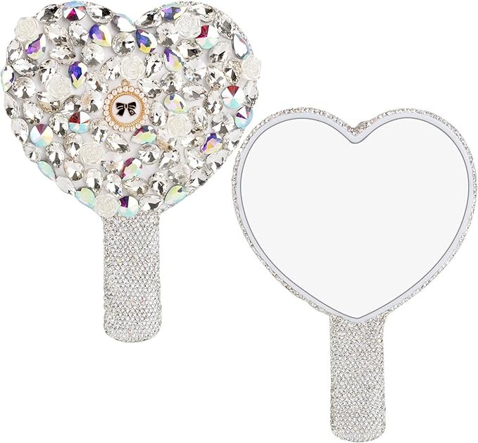 AUEAR, Rhinestone Handheld Mirror Bling Glitter Cosmetic Dazzling Portable Hand Mirrors with Handle for Women White Love Heart
